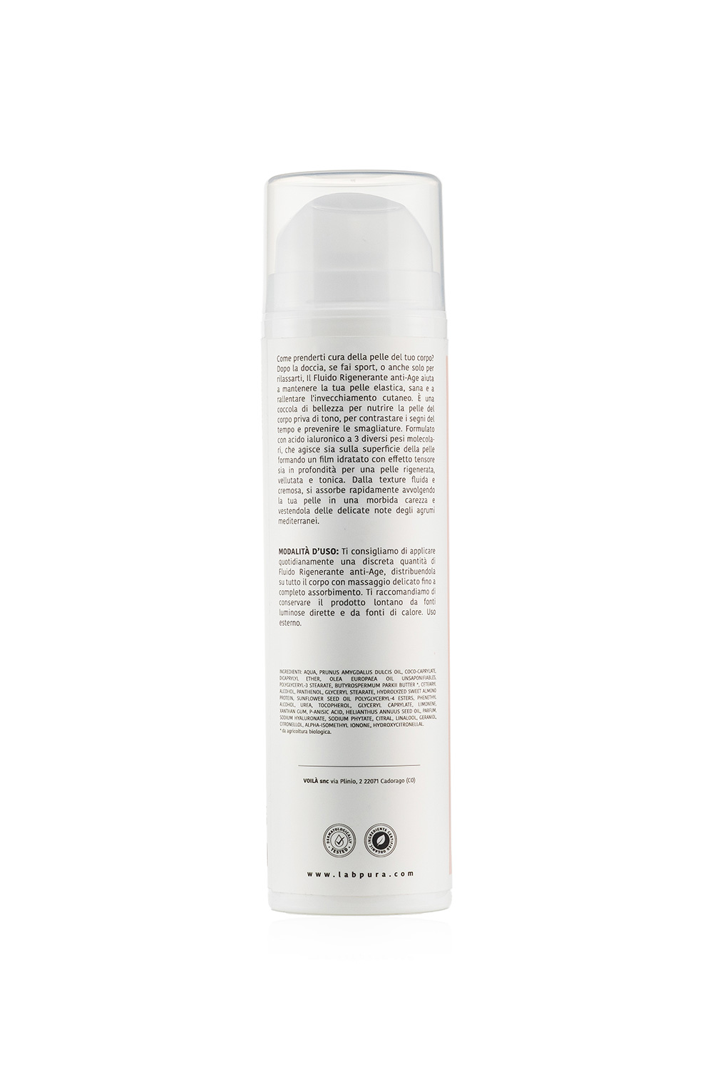 Come prenderti cura della pelle del tuo corpo? Dopo la doccia, se fai sport, o anche solo per rilassarti, Il Fluido Rigenerante anti-Age aiuta a mantenere la tua pelle elastica, sana e a rallentare l’invecchiamento cutaneo. E’ una coccola di bellezza per nutrire la pelle del corpo priva di tono, per contrastare i segni del tempo e prevenire le smagliature. Formulato con Acido Ialuronico a 3 diversi pesi molecolari, agisce sia sulla superficie della pelle formando un film idratato con effetto tensore sia in profondità fino al derma rimpolpando la pelle dal suo interno per una pelle rigenerata, vellutata e tonica. Dalla texture fluida e cremosa, si assorbe rapidamente avvolgendo la tua pelle in una morbida carezza e vestendola delle delicate note degli agrumi mediterranei.